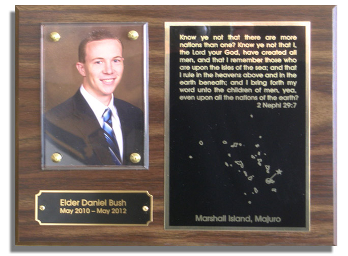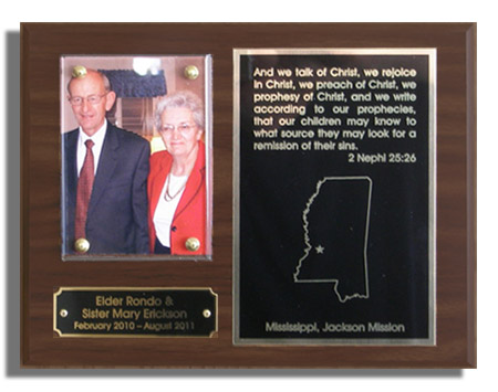 A great way to recognize the service of the missionary, soldier, or volunteer in your church or group. These 9" x 7" plaques include an 3" x 4-1/4" acrylic photo cover plate, Engraved brass nameplate and engraved metal quotation and service area plate. Get the look of hardwood for less! Our standard plaques are made of a of a walnut finished hardboard for the look and feel of solid wood without the expense. Oak, mahogany, and black finishes are also available. For those who want the quality of actual solid hardwood; solid walnut, oak, cherry and for the ecologically minded new bamboo plaques can be provided. Plaques include a keyhole slot for wall or display case hanging. Hardware can be provided for those who wish to mount the photo themselves, or a photo may be brought or sent in for free mounting by us. For a small convenience fee photos may uploaded to us for printing mounting and plaques can be shipped direct to you. Plaques may be picked up at our main office upon completion or they can be mailed direct to you. Production time is approximately 3 to 5 working days from the time the order is placed.